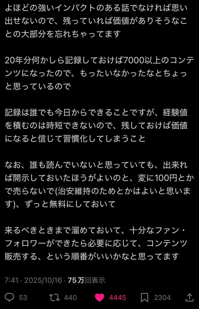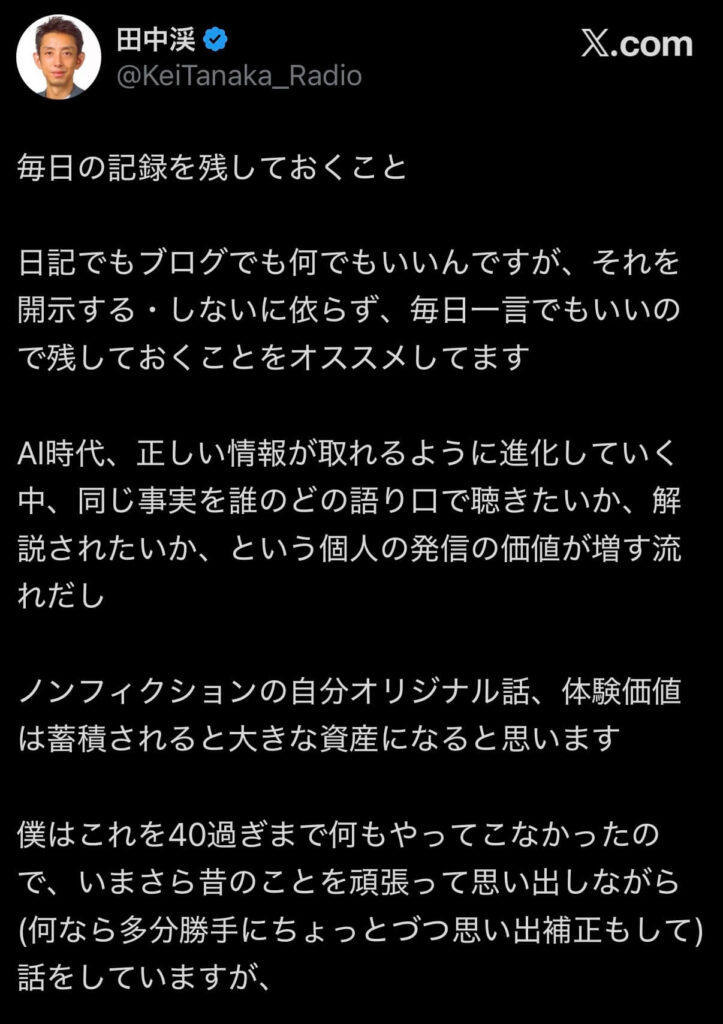 自分の敬愛する田中渓さんがXで、なんでも良いから日記をつけとくとコンテンツとして使えることになる可能性があるから良いよということが書かれていて、それもそうだなと思ったという単純な理由でやってみようと思ったのだ。