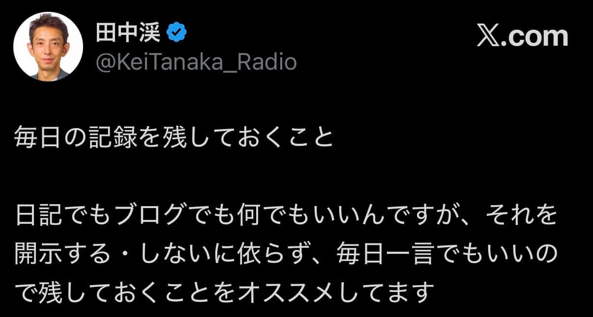 自分の敬愛する田中渓さんがXで、なんでも良いから日記をつけとくとコンテンツとして使えることになる可能性があるから良いよということが書かれていて、それもそうだなと思ったという単純な理由でやってみようと思ったのだ。